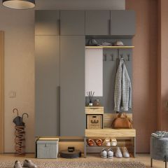 Состоит из: зеркала, полками открытыми и закрытыми, а также ящиками выкатными для мелочей.